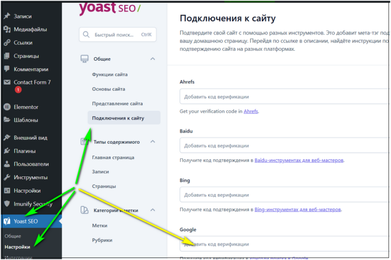 Открываем на ПК, слева Yoast SEO —> Настройки —> Подключения к сайту —> ищем окошка для Гугла (желтая стрелка на скрине). Туда вставляем этот буквенно-циферный код.